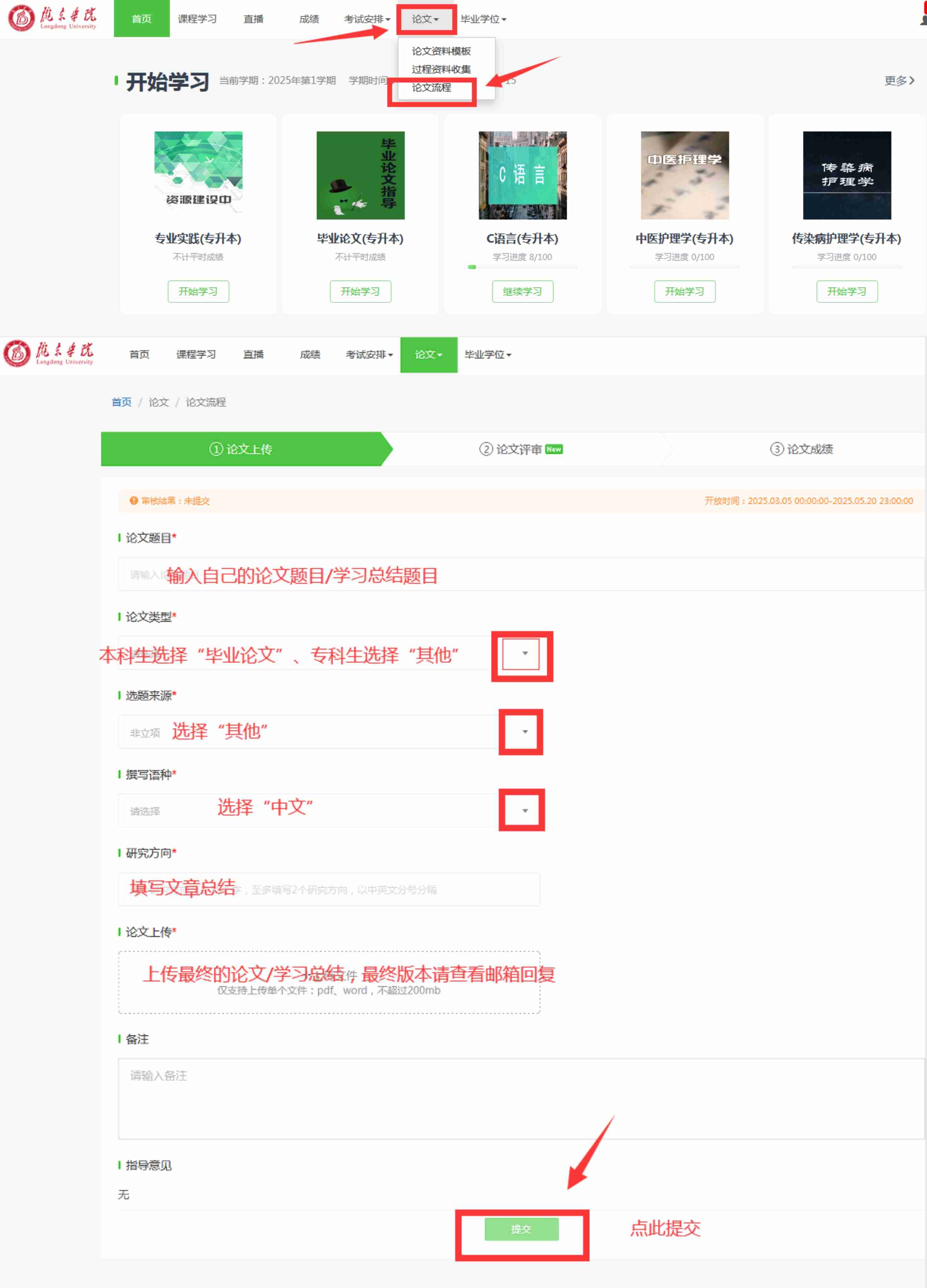 2、登录成功后,点击页面上方的“论文”--“论文流程”--根据提示填写相关信息并上传论文/学习总结【最终版请查看邮箱回复】--点击页面下方的“提交”。