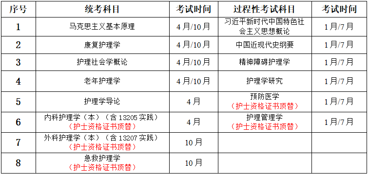 注:报考护理学专业取得国家护士执业资格证书者,可申请免考以上护士资格证书顶替课程,免考课程不减免学费。